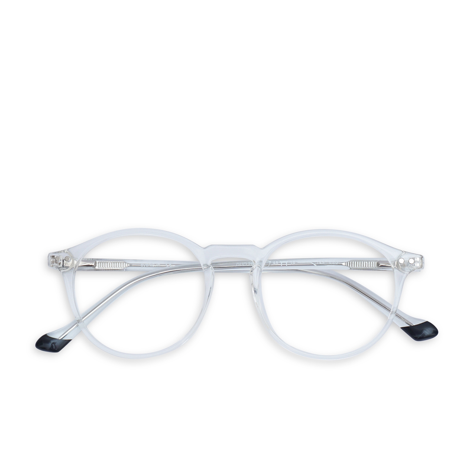 Please Note that the frame in the "Buy Frame only" option comes with a demo lens which may have printing on it. Choose another Buying option for Clear Lenses.